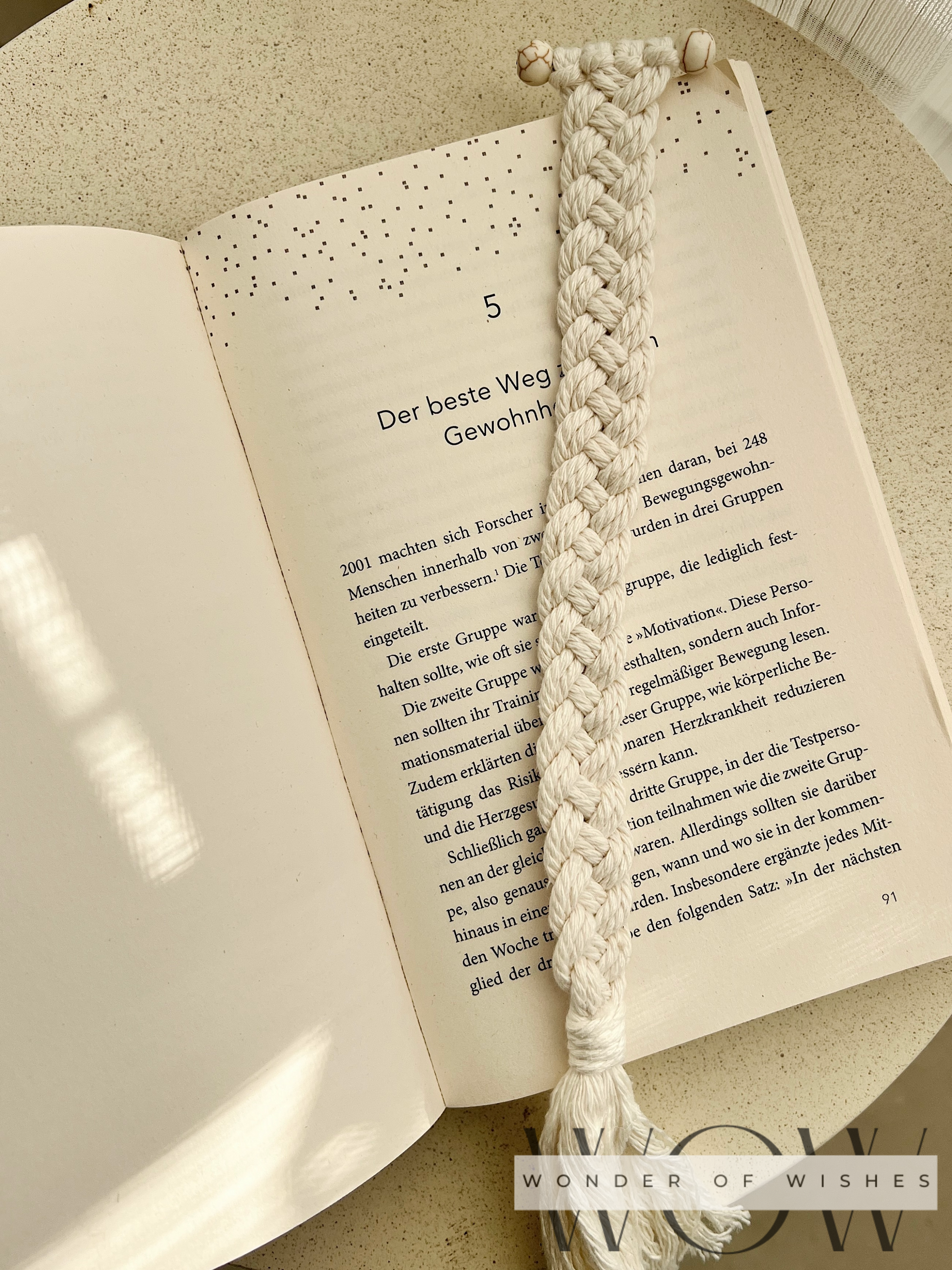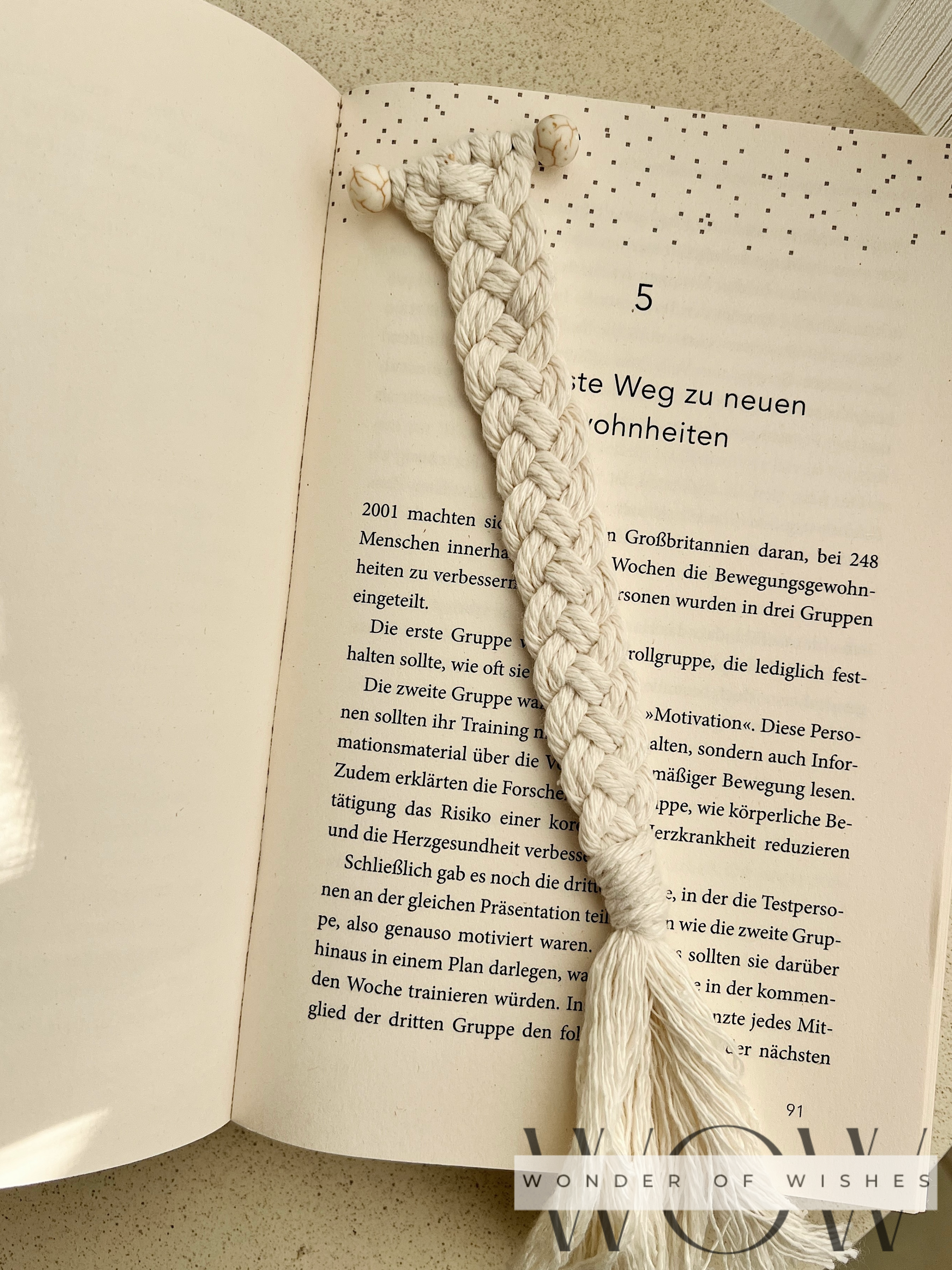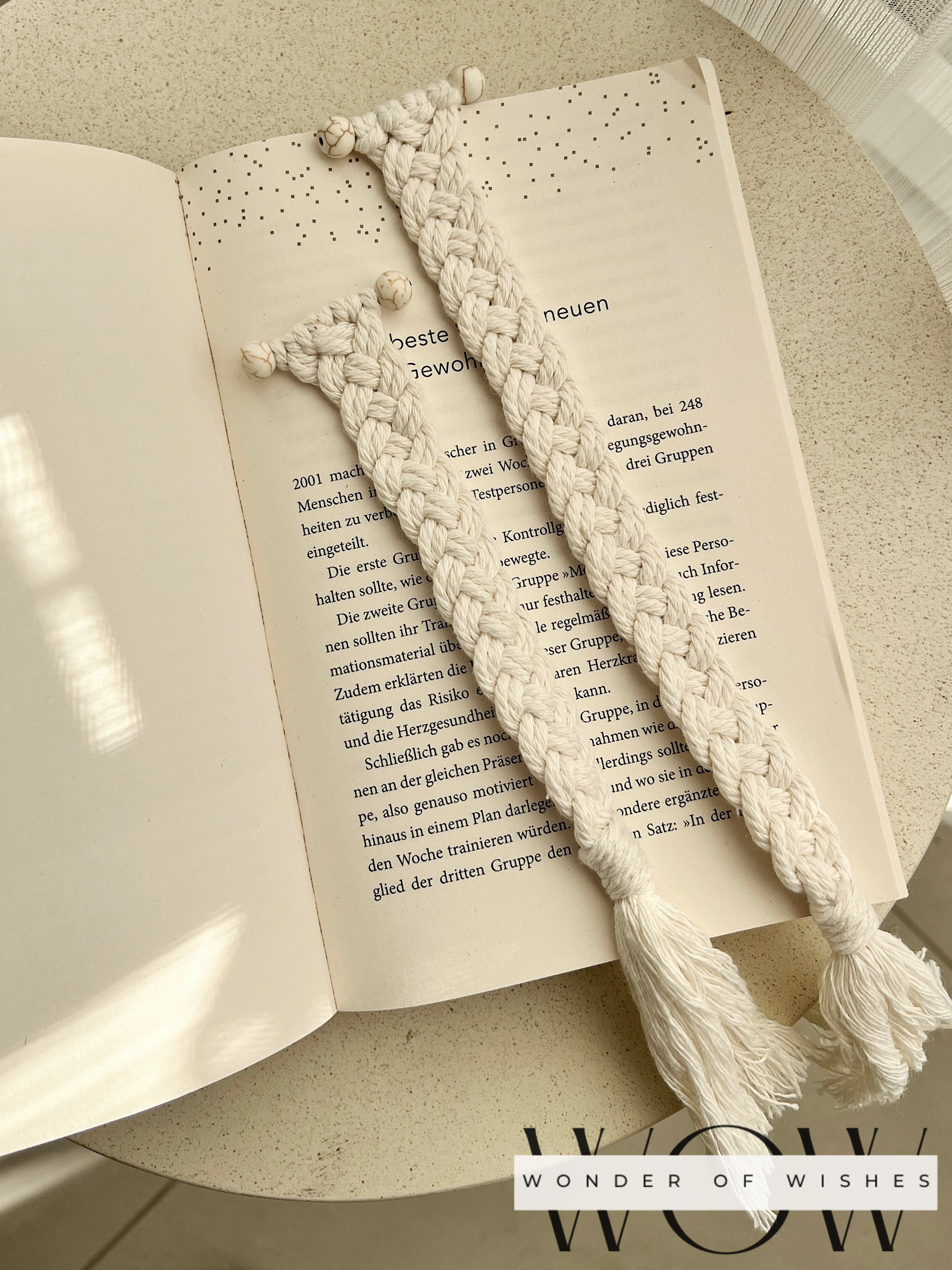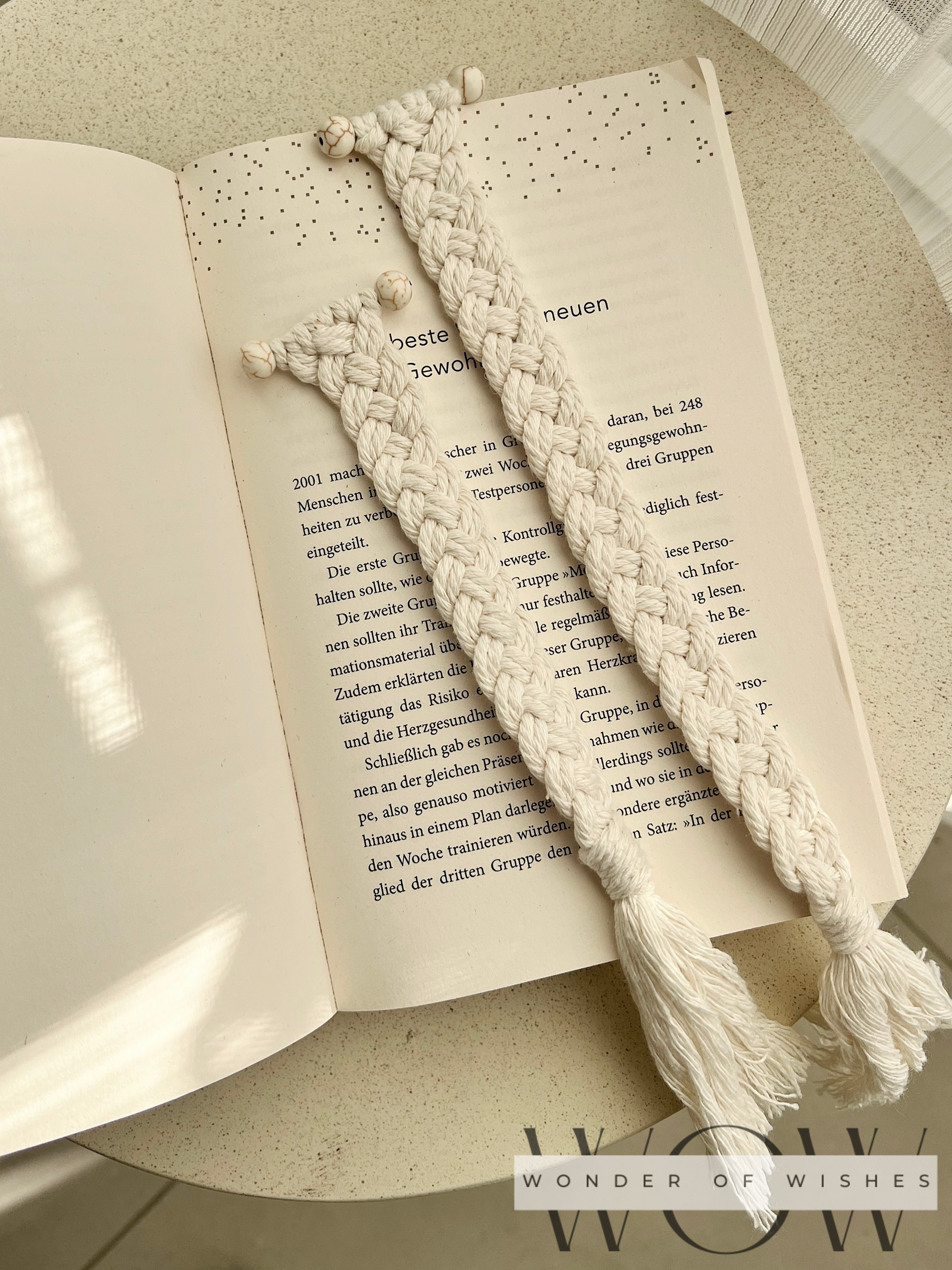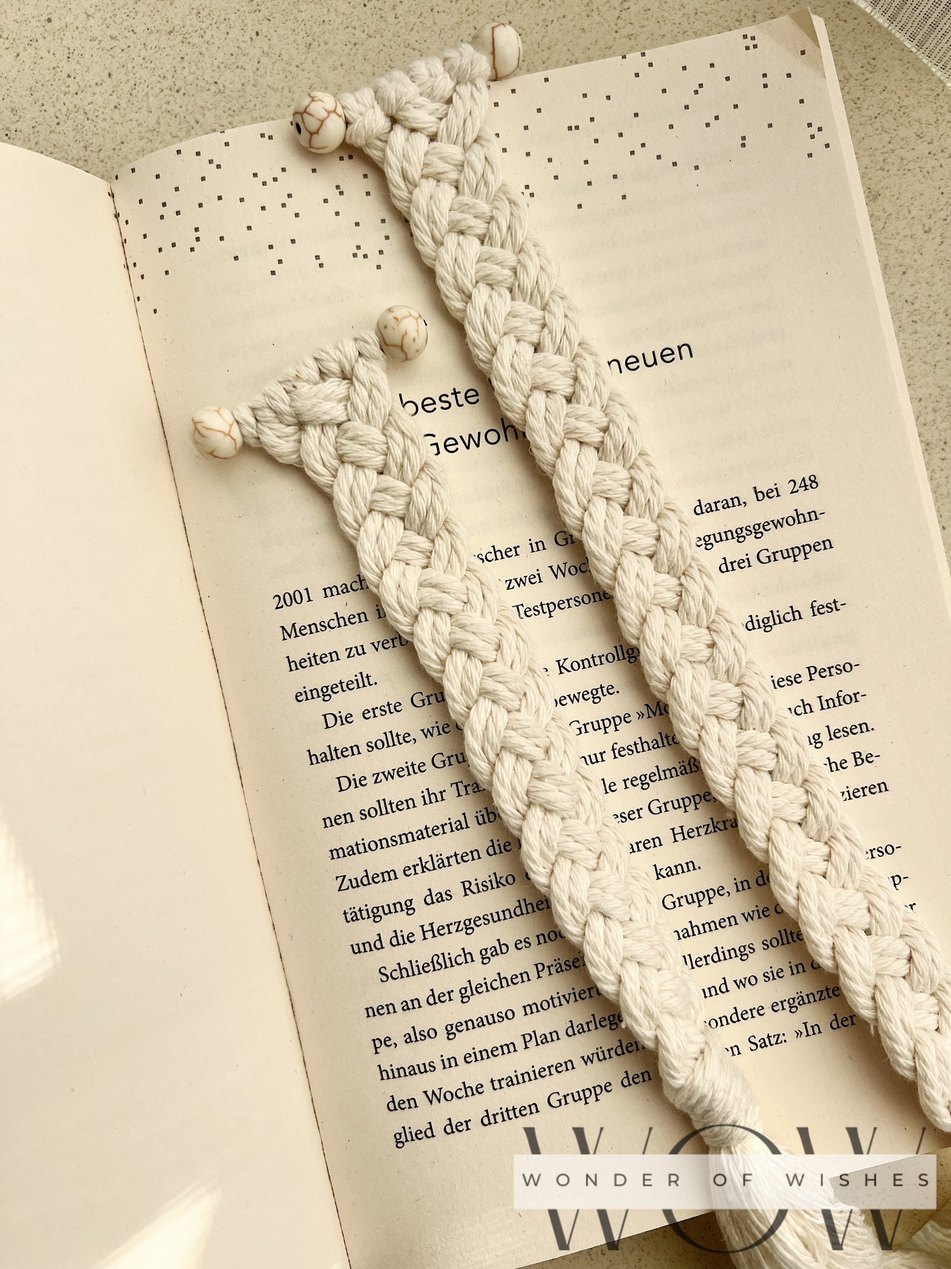 Mit viel Liebe geknüpft und verziert mit zwei Natursteinen jedes Stück ein einzigartiges, stilvolles Accessoire für Bücherliebhaber.