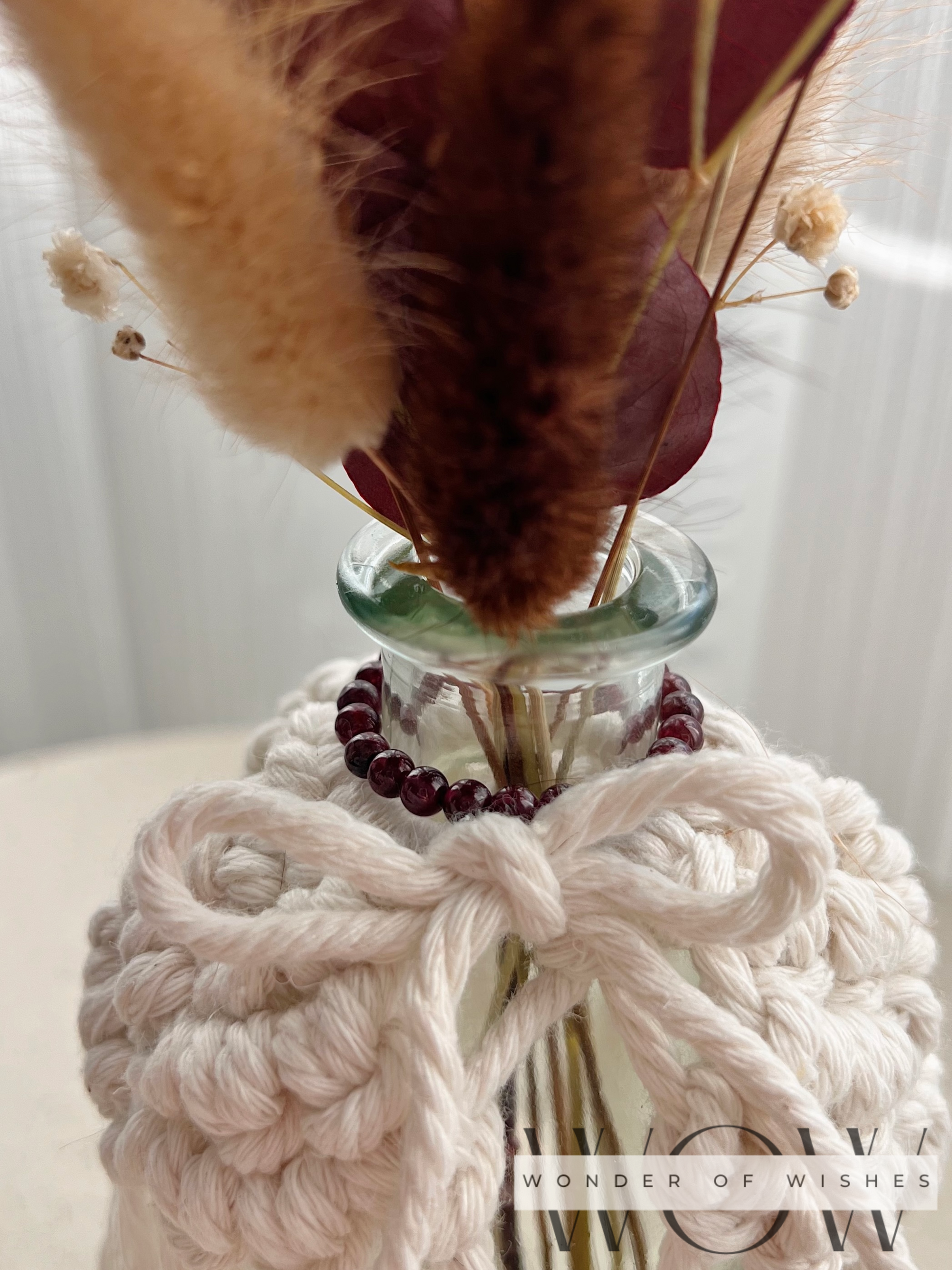 Handgefertigte Makramee-Vase aus weissem Garn, verziert mit ausgewählten Natursteinen, ein stilvolles Deko-Highlight für jedes Zuhause.