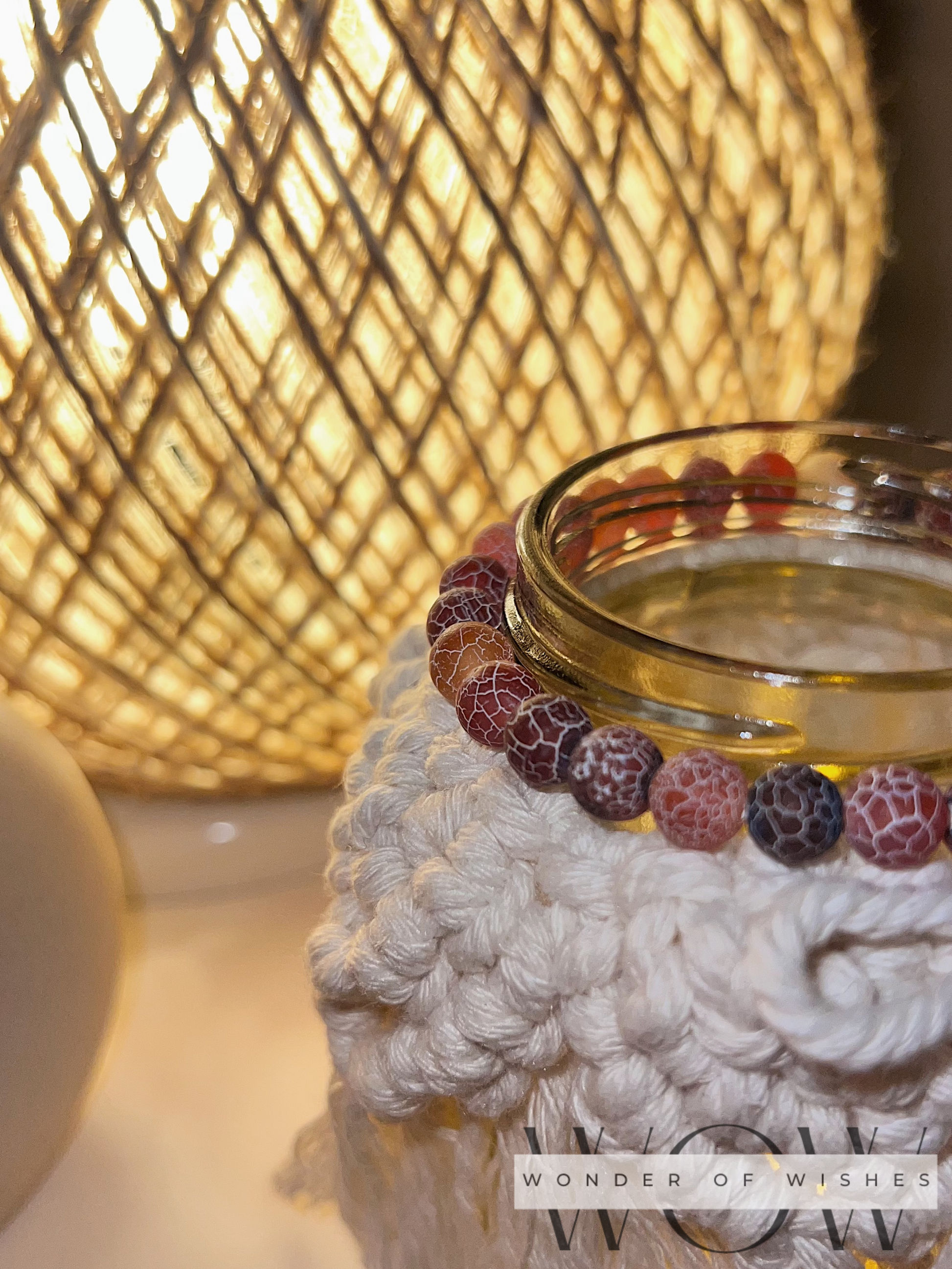 Diese beige Makramee-Windlichter aus recyceltem Glas bringen sanftes Licht und natürliche Wärme in jeden Raum. Mit zarten Natursteinperlen veredelt und in mehreren Größen verfügbar. Jedes Windlicht wird in Handarbeit gefertigt und ist ein echtes Einzelstück.